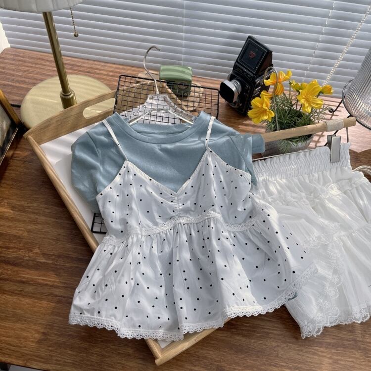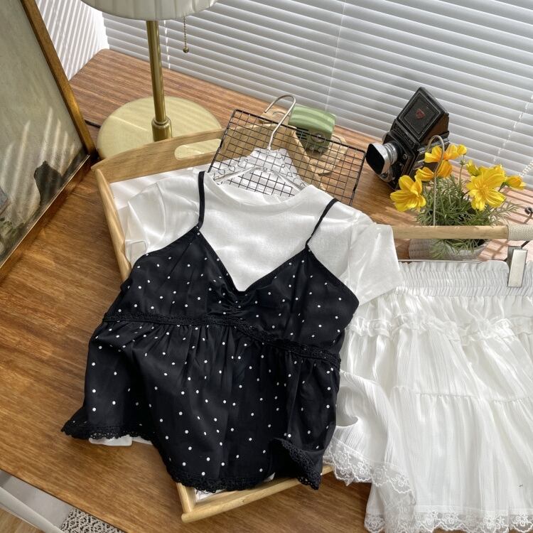 シンプルなTシャツと可愛いドット柄のビスチェのセットは、コーディネートの幅が広がります。韓国ファッションの影響を受けたデザインで今人気のアイテムです。Tシャツはカジュアルに、ビスチェは女性らしさを演出してくれる組み合わせが魅力的。