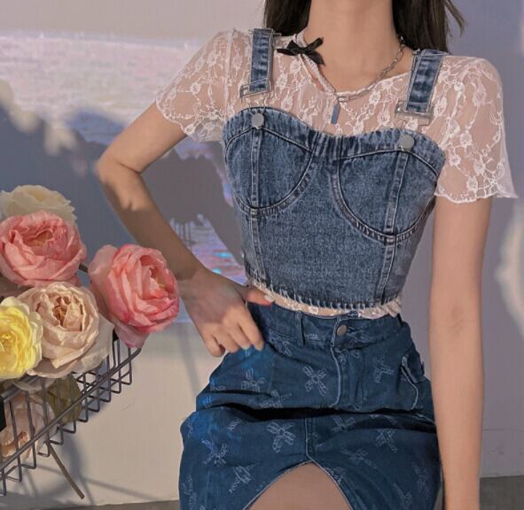 繊細なレースとシースルー素材が涼しげな夏トップス。デニム生地のビスチェもおしゃれな一枚。レースの透け感が女性らしさを引き立て、デニムのビスチェとのコーディネートで今っぽく着こなせます。柔らかな風を感じながらお洒落を楽しみたい、そんな大人の女性におすすめです。